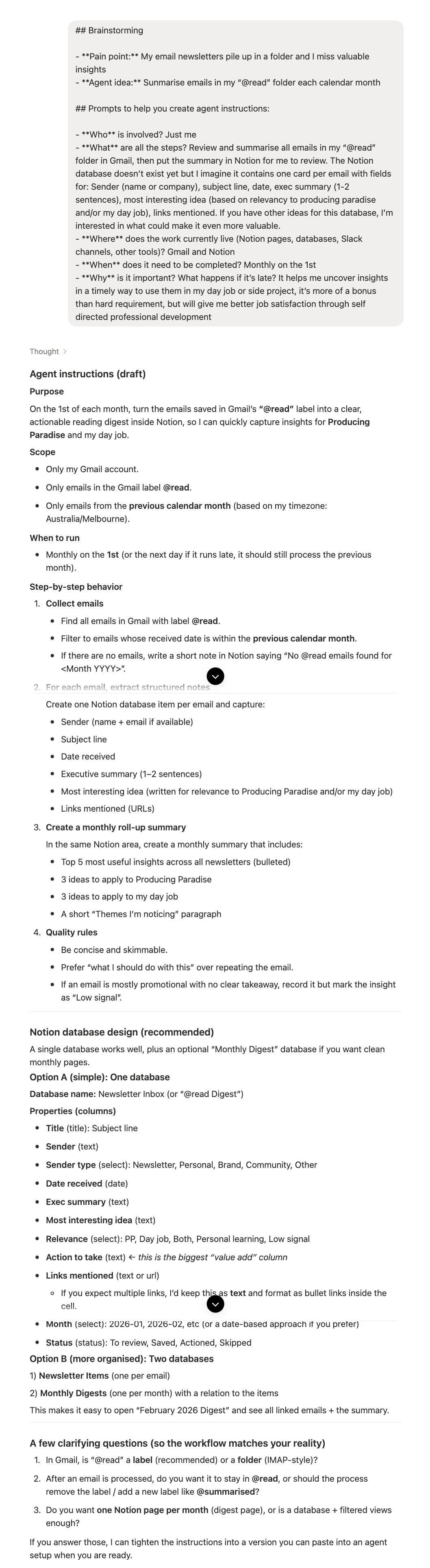 Defined a clear pipeline: Gmail @Read β one Notion item per email β move to Gmail @Summarised β update a monthly digest page