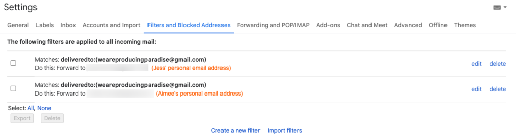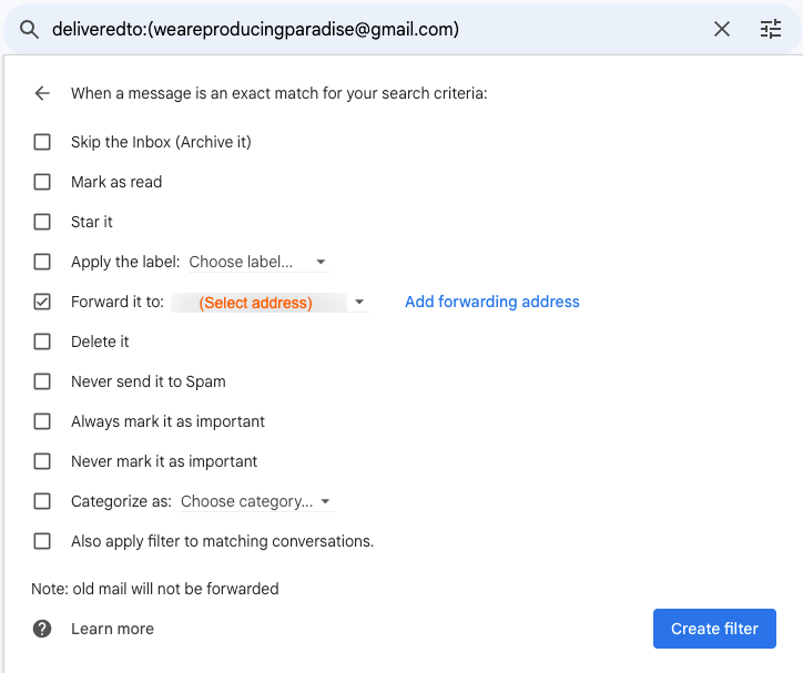So far, this system is working for us. It took a bit of Googling and some annoying steps (like waiting for each person to verify their email address, since we weren’t altogether when setting it up) but now it’s in place we all get the Producing Paradise emails sent to our personal accounts so we’ll see them without having to log into a separate email account. And it made for another tidy little blog post, in the hope it may be helpful to someone in the future (...you, perhaps?).