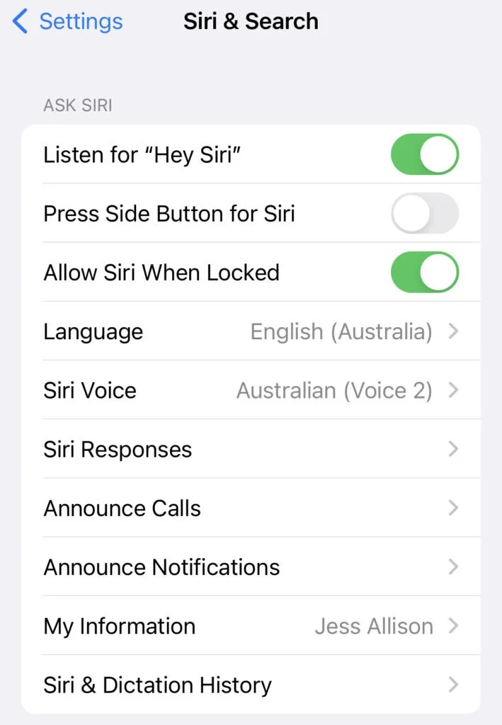 The Siri settings screen