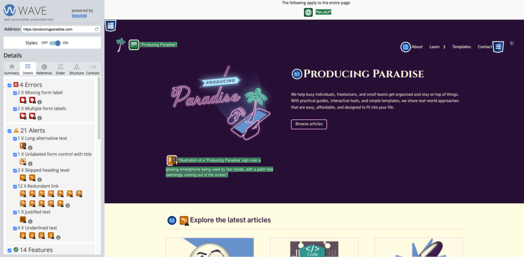 Summary: Improving website accessibility benefits all users and boosts engagement, SEO, and usability. Inspired by Better Allies, we audited Producing Paradise and made changes like adjusting heading levels, refining alt text, and avoiding justified text. Key takeaways: run accessibility tests (WAVE, Lighthouse, WebAIM), use clear navigation, write alt text properly, avoid emoji bullet points, and ensure keyboard/mobile compatibility.